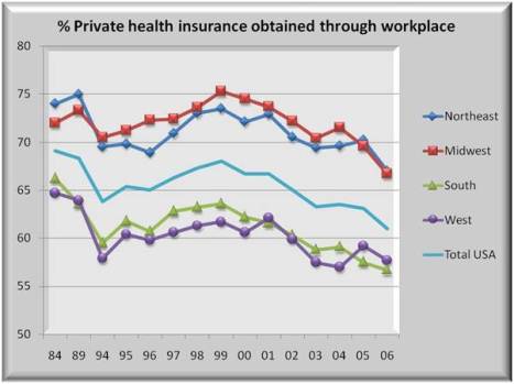The graph below shows the percent of employees obtaining insurance through their workplace by 4 regions and the USA as a whole. The trend is almost consistently downward beginning around the year 2000. The Midwest which once had the highest percent of employees insured, has dropped some 8% in just 6 years.