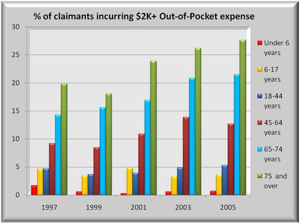 Not only are insurance premiums taking a growing percent of compensation, but out-of-pocket costs are compounding the problem. The graph below shows the percent of those having medical and drug claims whose out-of-pocket cost exceeded $2,000.