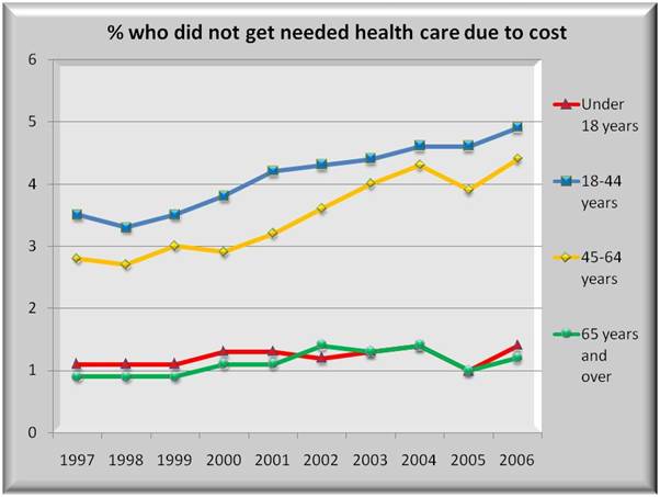 Those not getting needed medical care also varies by age, whether or not insured. Both older people and children are less likely to skip needed medical care due to costs while the two middle age groups appear willing to risk skipping needed care. Still, the trend for middle age groups is up.