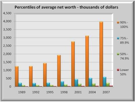 The graph below shows the growth in net worth from 1989 for four selected percentile groups. As one would expect, those less well off tend to work for others and their net worth (lower 50%) makes barely a blip on the scale.