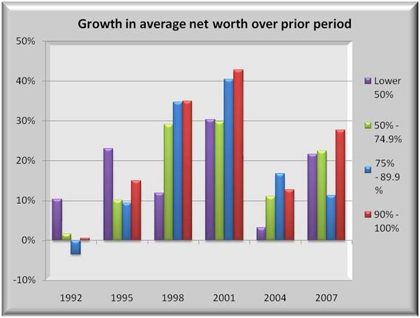 Even the net worth of the 50%-90% groups is modest. The greatest concentration of accumulated wealth is in the top 10%. And that group not only grew more in absolute dollars, but also as a percent gain over prior periods.