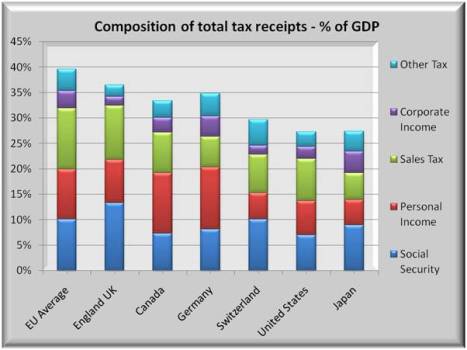How does the U.S. compare in total taxes with these other countries? The graph below shows tax components. Despite complaints about corporate rates, U.S. take is lower than most countries. Sales taxes are high but discretionary (no buy, no tax) as states rely heavily on this source.