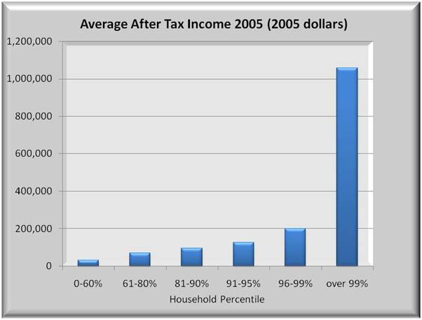 Where does one look for new taxes. While there are several options, one key is to see who is earning what today. The graph below displays the average after tax income for selected percentile groups. The small blip at the furthest left is the average income of 60% of the U.S. Those in the 61% to 95% range average somewhat better. Also noted is the greater number of households in these groups’ results in their paying the majority of income taxes.