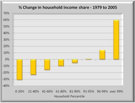 The graph below employs the same groups as above. For several reasons, there has been a substantial income shift with enormous increases in income for the top 1%, with modest increase for the 95%-99% group. ALL the rest of the percentile groups actually lost ground, and the lower the income bracket, the greater the loss.