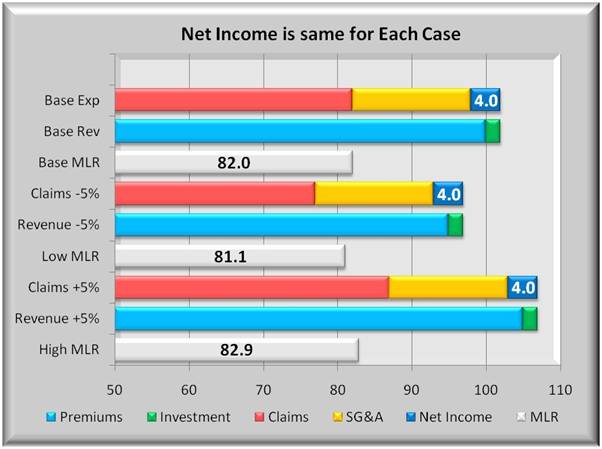 The first bar in each case represents claims, SG&A expense and profit margin. The second bar represents premiums and a small investment income (green). By definition, profit plus expenses must equal revenue so those two bars are always equal length. The third bar of each case is the MLR.
