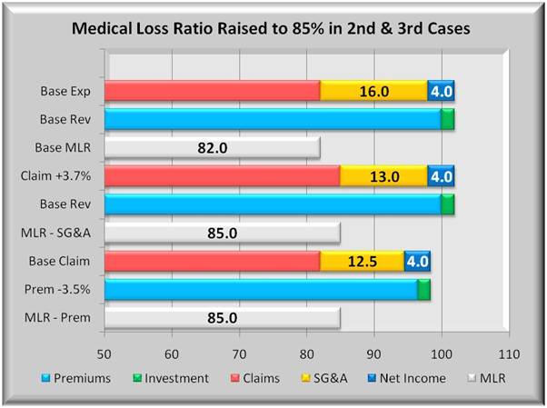 In the second case, claims are lower. But unless premiums are reduced, the MLR will go down. Further the premium reduction will eat into profits to maintain the MLR. If claims rise as in the third case, and if the market will bear, higher premiums will generate added profits without incurring a reduction in MLR.