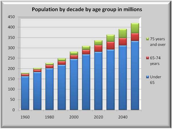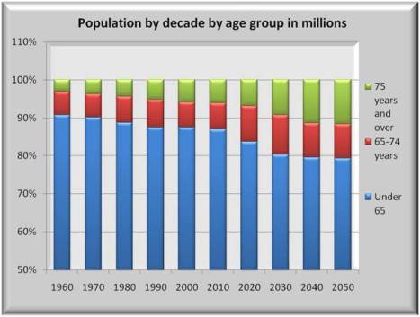 As expected, growing populations result in growing health care costs. What is evident from the graph below is that in addition to overall growth, the percent of people 65 years and old is increasing.
