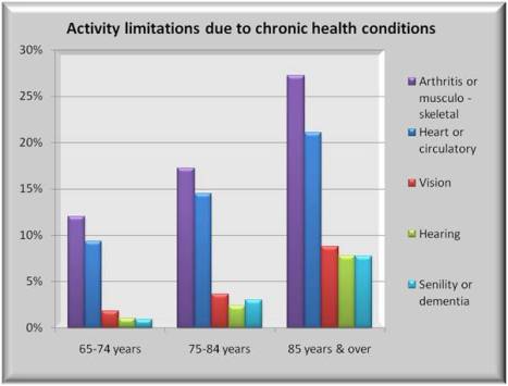 Nearly 3 in 10 seniors over 85 will become limited by arthritis or musculoskeletal conditions. 2 in 10 seniors over 85 will be limited by heart or circulatory conditions. Though climbing with age, vision, hearing and senility are factors in less than 1 in 10 seniors 85 and older.