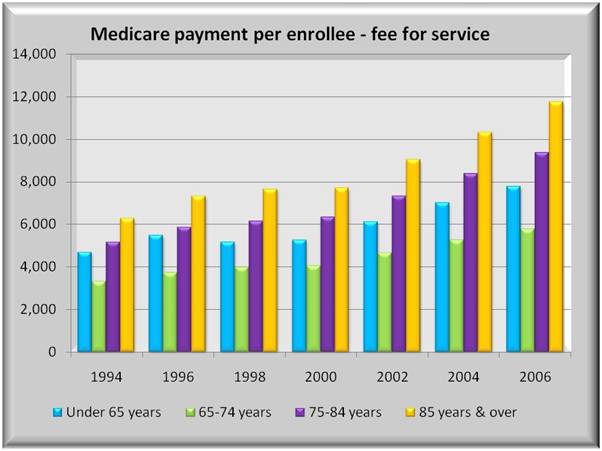 The graph below highlights cost trends for four groups of people from 1996 to 1996. Except for a slight break around, 1998 – 2000, costs have trended upward every year for every age group. Within each age group there is another consistent trend. Seniors 65-74 years incur only about half the expense that seniors 85 and over do, while those 75-84 years incur more than half again as much as seniors 65-74. This confirms the comments above that as people age, their health demands increase.