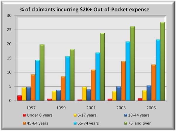 In nearly all cases where medical expense is incurred, insurance picks up a large share of the costs, but not all. Amounts paid by individuals is called “cost sharing” or deductibles and co-payments, or out-of-pocket expense. Below are 6 age groups that incurred over $2,000 in out-of-pocket expense. This threshold allows a focus on the more expensive medical encounters. Cost sharing for all seniors has consistently risen over the entire period. Any solutions to rising Medicare costs that reduce benefits, shifting more costs to seniors should at least take into account that seniors have for years, been paying higher out-of-pocket costs for health care.