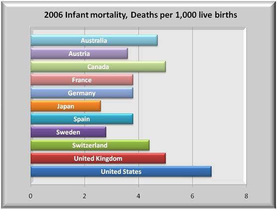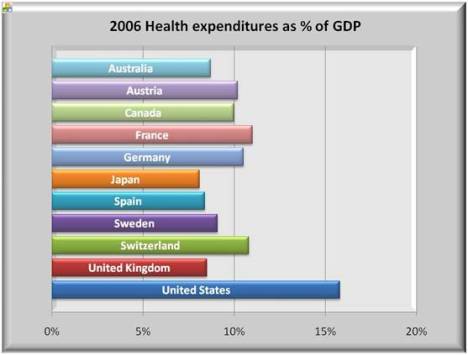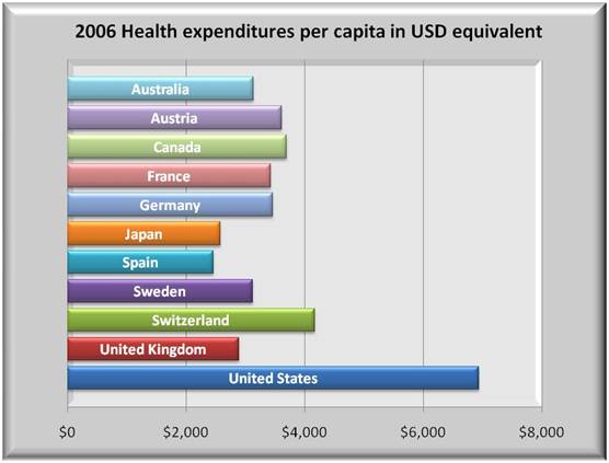 A summary glance at the graphs below should serve notice to all that the U.S. healthcare is in crisis. The left graphs show 2006 health spending both as a percent of GDP and on a per capita basis to be far above all other nations in the OECD (Organization for Economic Co-operation and Development).