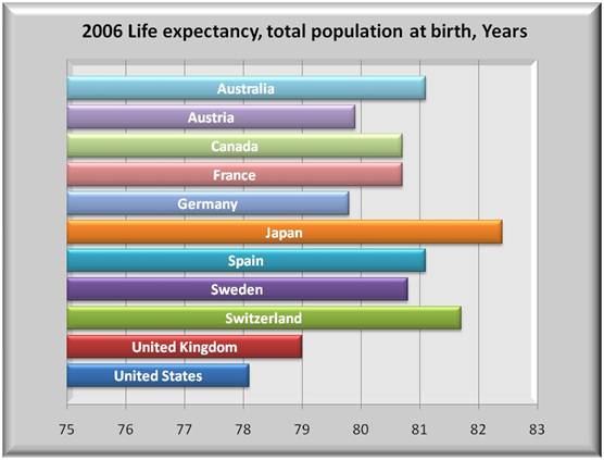 All data in this report are derived from OECD Health Data 2009 – Version: June 09 . Below each graph are all nations’ computed average, the percent the U.S. is over or under that average, and the min and max for those criteria.