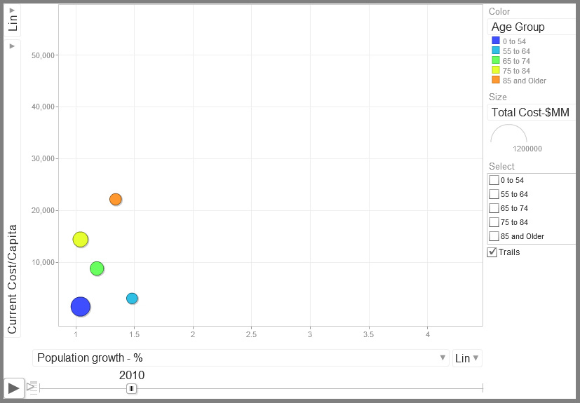 The vertical axis reflects the per capita cost.  The height of each circle matches the bars of the  2004 graph adjusted for inflation.  Medical inflation was conservatively estimated at 5% in 2010 declining 1% every five years until reaching 2% and remaining a constant 2% thereafter.