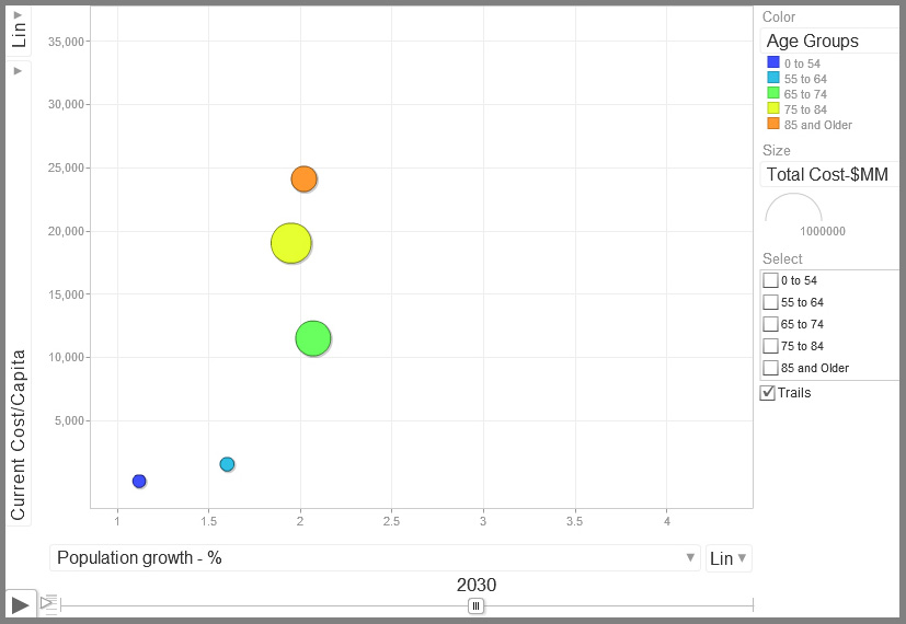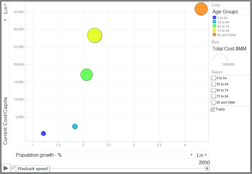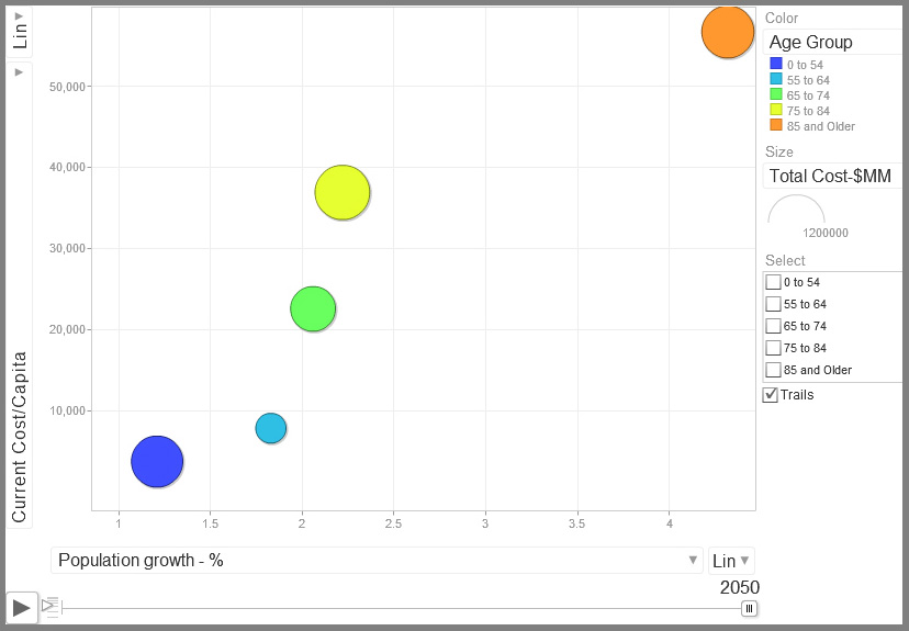 Public Medical Spend: In 2010, the largest public medical spending was for younger people (0 to 54) as shown in the lower left corner of the first graph. Through time, the three oldest age groups not only move further right but higher up the cost scale.  By 2050, the costs for the two oldest groups each exceed the total costs for the entire population 0 to 54.