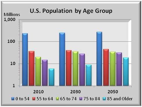 The graph above shows the population of five age groups at 2010, 2030, and 2050.  The vertical axis is logarithmic scale that gives a visual focus to smaller numbers, in this case, the smaller groups of seniors.  The bulk of the population (ages 0 to 54 and 55 to 64) grow only gradually over the 40 year period of the graph.  The three senior groups grow faster than those under 65 as seniors live longer and project to continue to do so far into the distant future.  The result is the average American continues to get older. This has consequences not only for and Social Security but for labor markets as well.  Fortunately, minor adjustments to Social Security benefits can continue its solvency since only age need be considered.