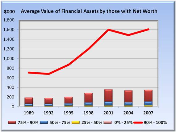 The accumulation of savings from income will, over time lead to an increase in wealth. This report section looks at components of wealth as derived from the Federal Reserve’s 2007 Survey of Consumer Finances Chartbook. The survey is taken every 3rd year since 1989. The next graph highlights the average value of assets over this period by those who have a positive net worth. Unlike the income section which divided households into quintiles (fifths), these Federal Reserve data are divided into quartiles (fourths) with the top divided again, from 75% – 90% and the top 10%. As with income, wealth is concentrated at the top of the pyramid. The results are not a surprise for 90% of the population that are shown as stacked bars in the graph below. Far above are the top 10% whose wealth dominates.